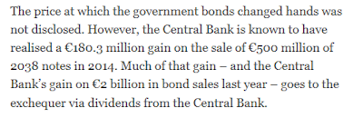 NONE of our national media reported the above; those that did, reported only that an IBRC bond had been 'cancelled', while some even suggested it was a 'good news' story, that we had gained on the whole deal! 'A profit of €180m handed over to the Exchequer!' it trumpeted, never bothering to question whence this 'profit' originated - it came from our NTMA, the ones from whom the Central Bank was getting all those hundreds of millions, all of which is borrowed.
